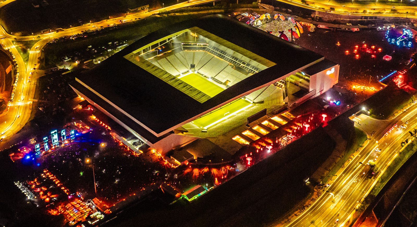 A área externa da Neo Química Arena já provou que funciona para festivais de grande porte. Os dois amplos estacionamentos permitem uma distribuição inteligente de múltiplos palcos, com fluxo tranquilo entre espaços e estrutura para dezenas de milhares de pessoas por dia. A infraestrutura própria do espaço garante banheiros de alvenaria, áreas cobertas e estrutura de qualidade, sem a precariedade de montagens temporárias que marcam outros grandes eventos ao ar livre.